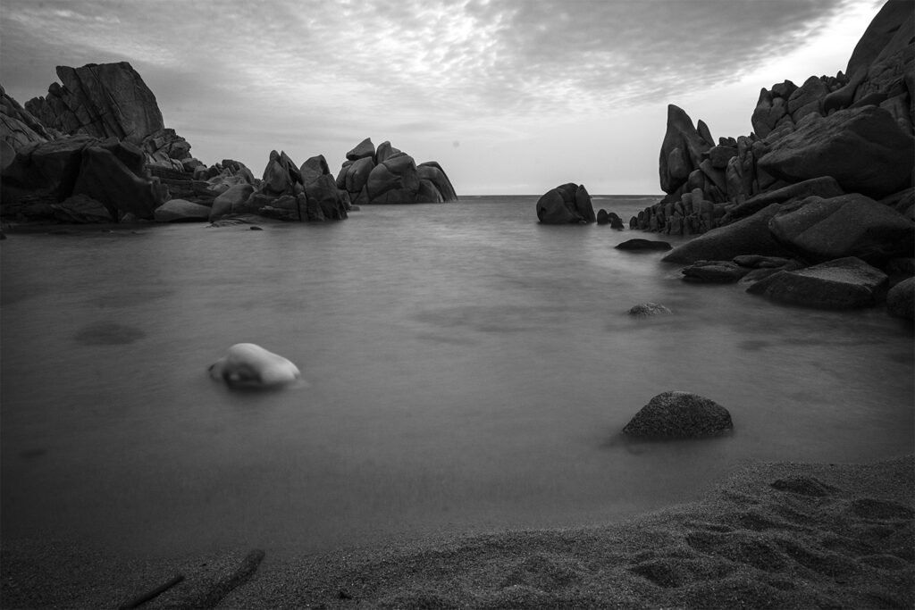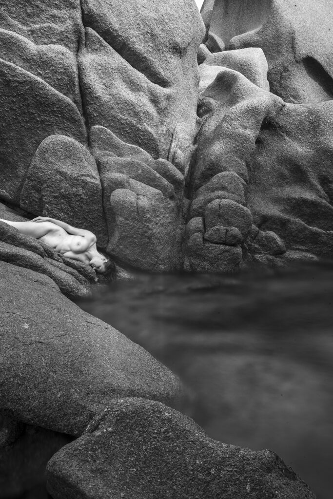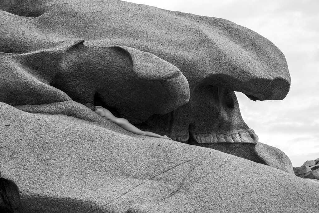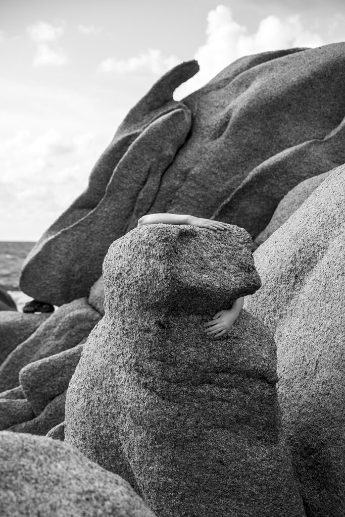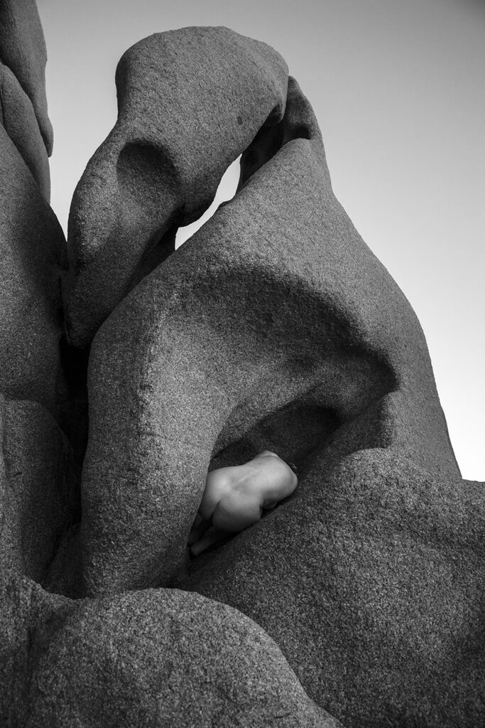 Réalisée dans la Vallée de la Lune, en Sardaigne, cette série en noir et blanc mêle le grain de la peau à celui du granit, sculpté depuis des millénaires par le vent, l’eau, le silence. Là, les tafoni, ces cavités creusées dans la roche, deviennent abris imaginaires, niches fossiles, lieux de disparition ou d’émergence.